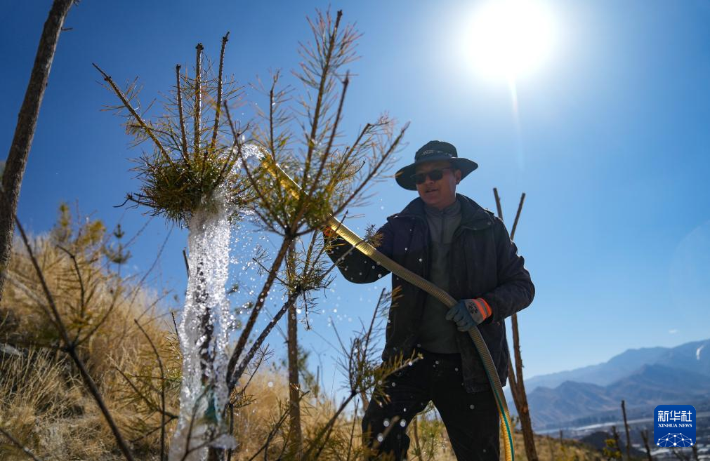3月12日,東嘎社區(qū)二組村民在給樹苗澆水。新華社記者 丁增尼達 攝 ??