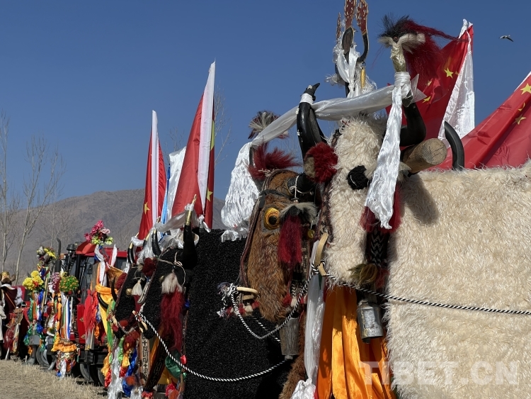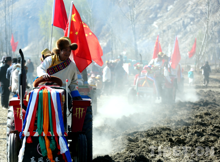 整個活動充滿儀式感。村民們先是來到田地中央燃桑香、獻貢品,祈求風調(diào)雨順、無災(zāi)無害、莊稼豐收。開耕第一犁在吉祥喜慶的藏戲《扎西雪巴》表演中拉開了序幕,一輛輛插著五星紅旗,用五彩哈達、花朵、吉祥圖案裝扮一新的拖拉機一字排開,涌向待墾的農(nóng)田進行翻耕,播撒第一粒種子。