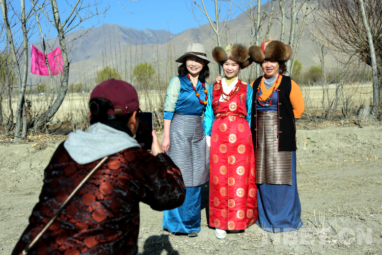 開耕儀式結(jié)束后,茶巴朗村藏戲隊成員們?yōu)樵缫褤Q好藏裝過來體驗西藏民俗文化的游客們獻哈達、敬青稞酒、唱敬酒歌,游客們現(xiàn)場學起“三口一杯”與當?shù)厝斯捕冗@美好的一天。西藏卓美旅行社負責人孫赫男介紹說:“西藏除了山水美景之外,春耕儀式也是非常具有當?shù)靥厣奈幕?,能給人留下深刻記憶。今天,我?guī)е鴣碜员鄙蠌V等全國各地的游客來這里體驗春耕儀式,讓大家看看西藏當?shù)氐娜罕娛窃鯓娱_始春天的。游客們穿著藏裝,免費品嘗青稞酒、酥油茶、牛肉、藏雞蛋等各種農(nóng)產(chǎn)品,還和充滿熱情的當?shù)卮迕駛兓?,他們玩得非常開心?!?