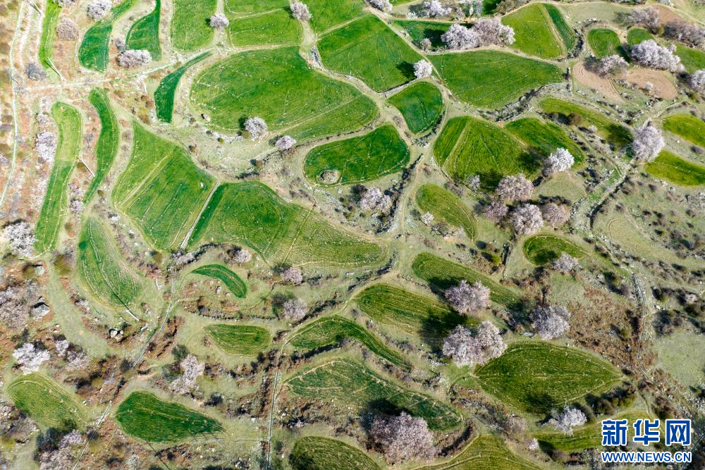 4月18日,在嘉黎縣尼屋鄉(xiāng)境內(nèi)田間盛開的桃花(無人機(jī)照片)。新華網(wǎng) 旦增努布 攝