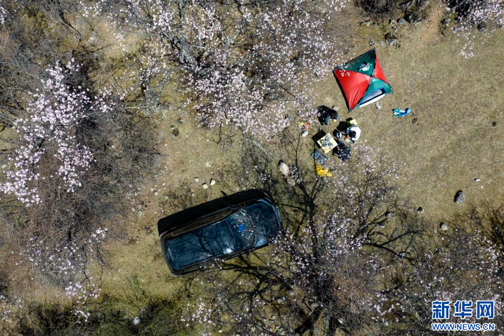 4月18日,群眾在嘉黎縣尼屋鄉(xiāng)境內(nèi)桃花間“過林卡”(無人機(jī)照片)。新華網(wǎng) 旦增努布 攝