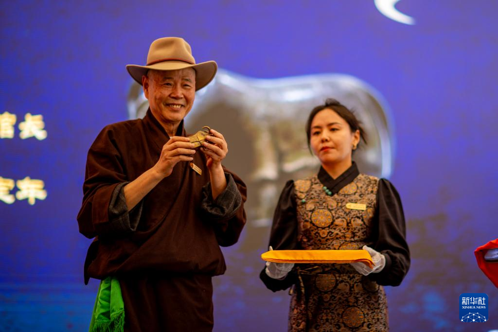 5月18日,吳雨初(左)在西藏牦牛博物館捐獻自己珍藏的銅牦牛文物。新華社記者 姜帆 攝 ??