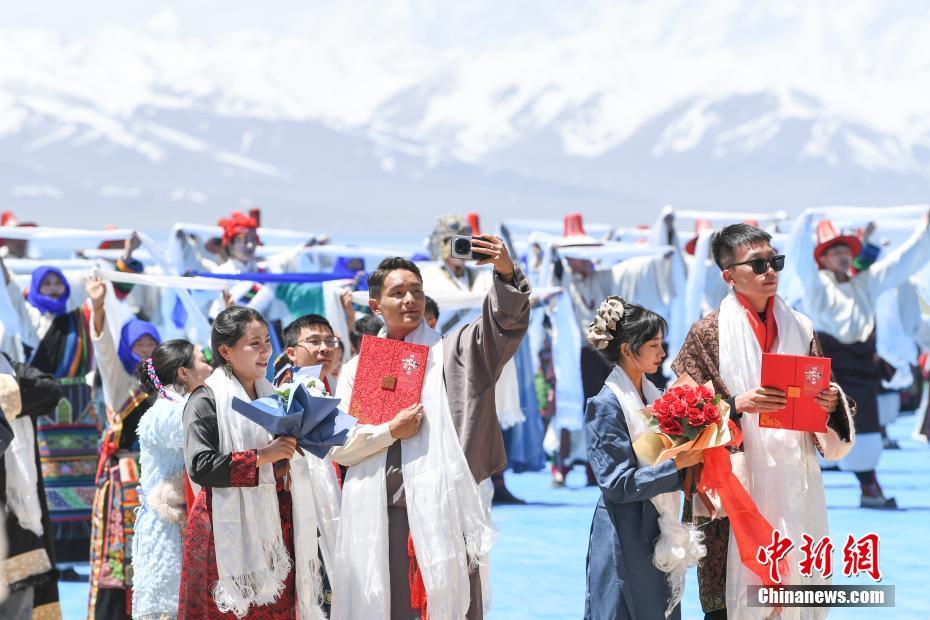 5月19日,隨著氣溫升高,西藏納木錯(cuò)解凍開湖,迎接即將到來的旅游旺季。納木錯(cuò),藏語意為“天湖”。圖為納木措開湖儀式上舉辦集體藏式婚禮。