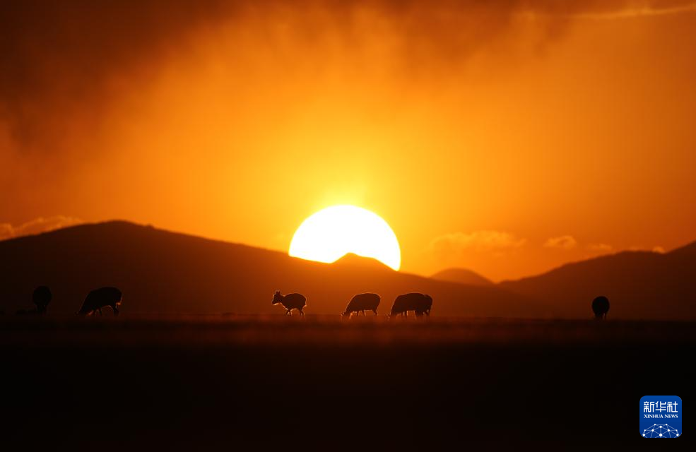 晚霞中魯確塘草原上待產(chǎn)的藏羚羊(6月16日攝)。新華社記者 費(fèi)茂華 攝