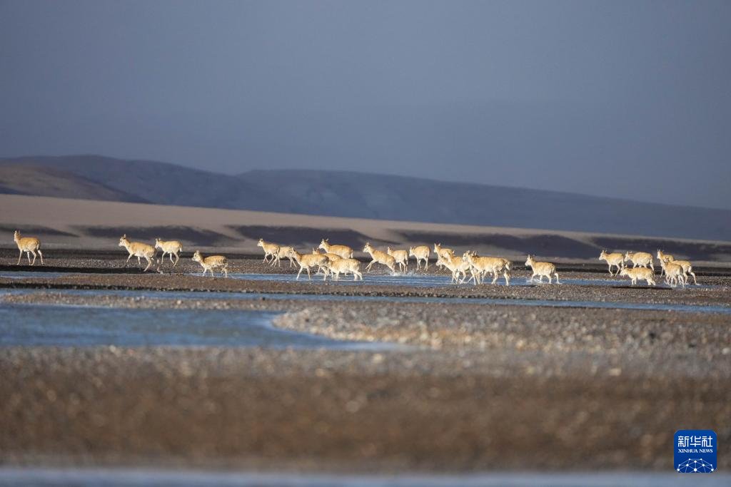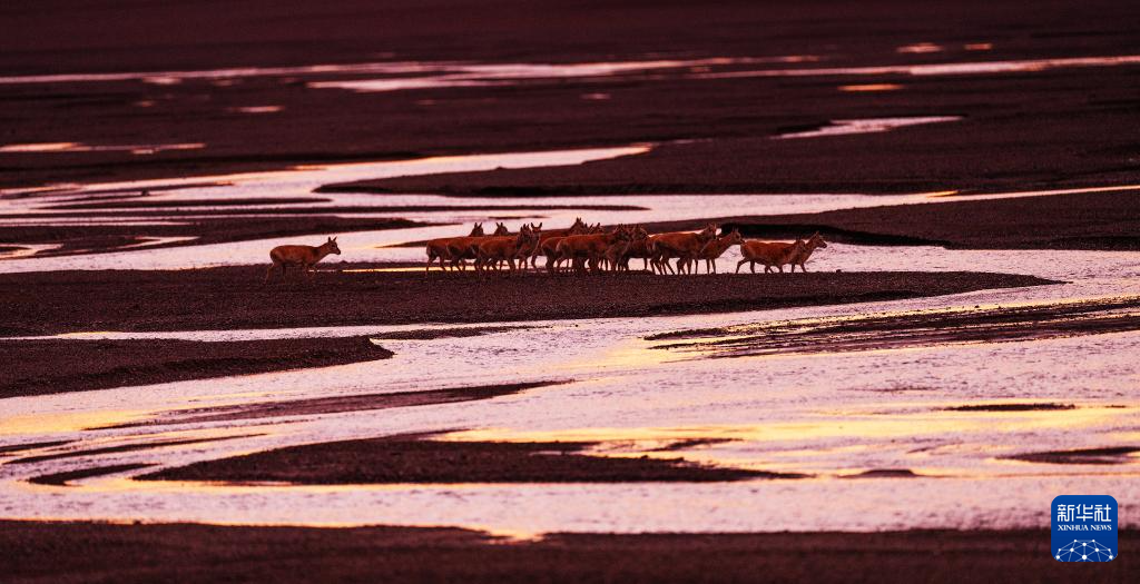 落日余暉中大群遷徙的藏羚羊行進(jìn)在甜水河畔的荒灘上(6月13日攝)。新華社記者 姜帆 攝