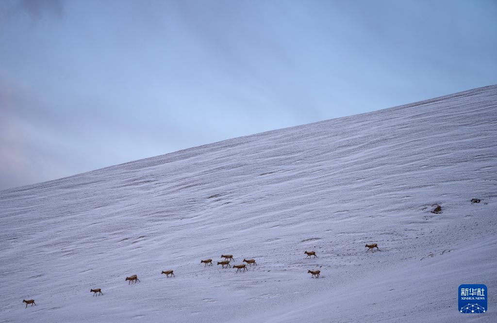 這是雪地中遷徙的藏羚羊(5月8日攝)。新華社記者 丁增尼達(dá) 攝