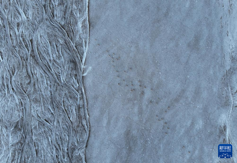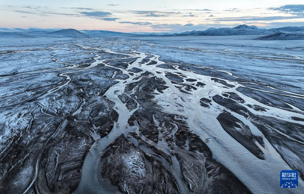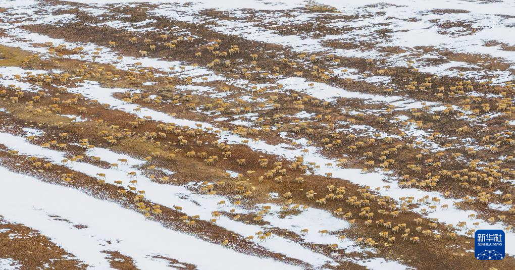 在甜水河畔荒灘雪地中向產(chǎn)羔地遷徙的藏羚羊(6月14日攝,無人機(jī)照片)。新華社記者 普布次仁 攝