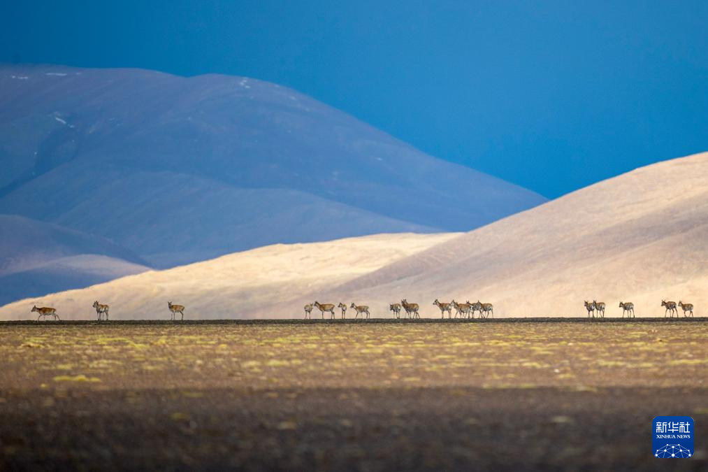 6月13日傍晚,在羌塘國(guó)家級(jí)自然保護(hù)區(qū),一群藏羚羊在遷徙。新華社記者 費(fèi)茂華 攝