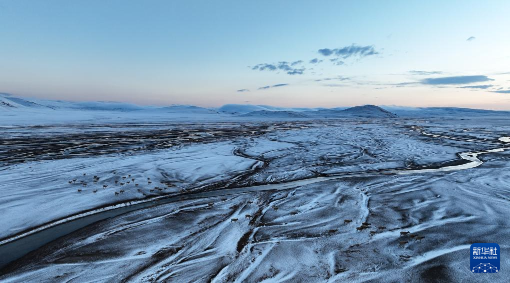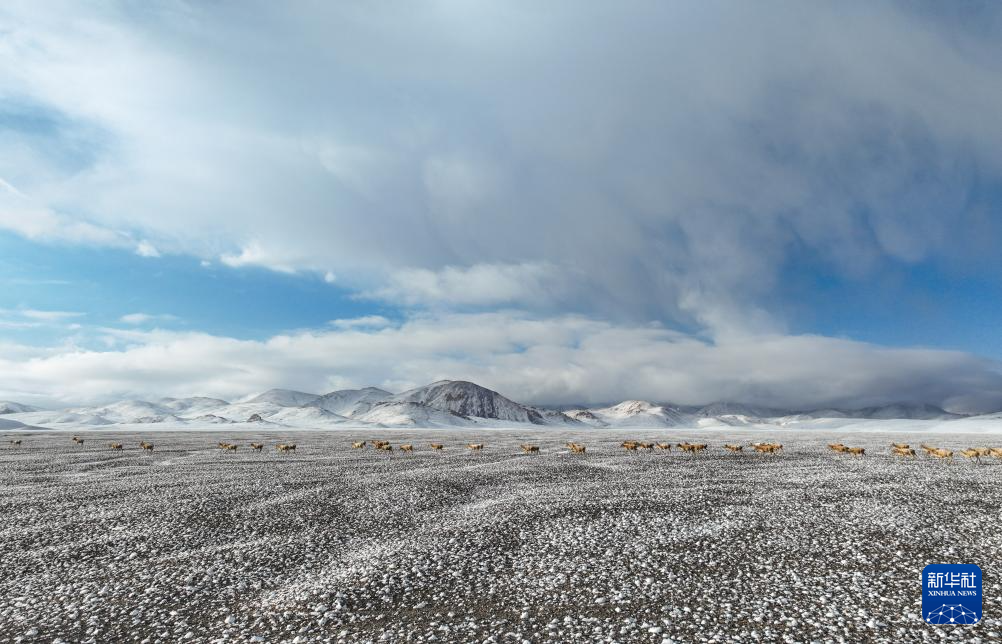 在甜水河畔荒灘雪地中向產(chǎn)羔地遷徙的藏羚羊(6月15日攝,無人機(jī)照片)。新華社記者 晉美多吉 攝