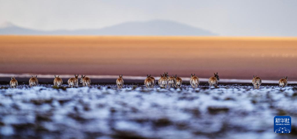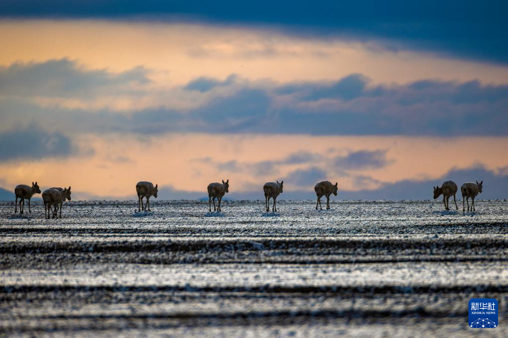 6月15日清晨雪后,在羌塘國(guó)家級(jí)自然保護(hù)區(qū),迎著朝霞前行在遷徙路上的一群藏羚羊。新華社記者 費(fèi)茂華 攝
