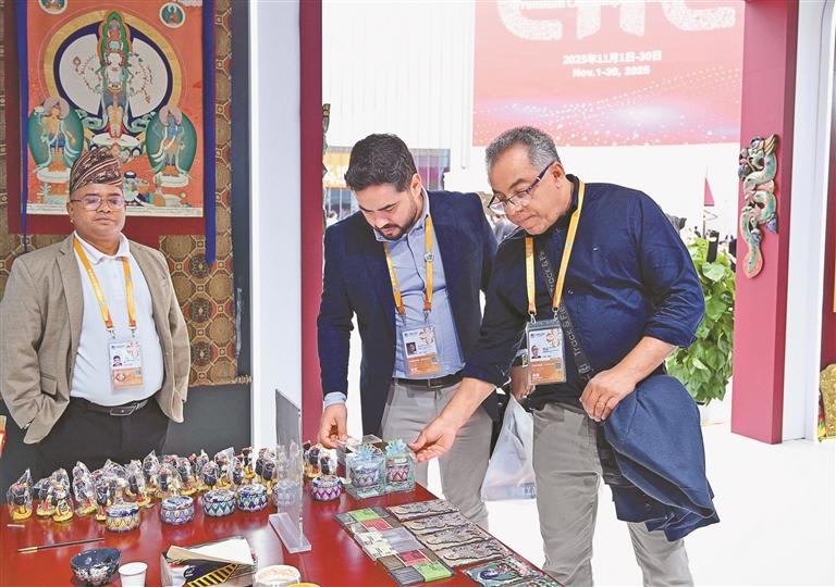 圖為第八屆中國國際進口博覽會西藏館內(nèi)的客人在選購商品。記者 王敏 索朗瓊珠 嘎松卓瑪 攝影報道