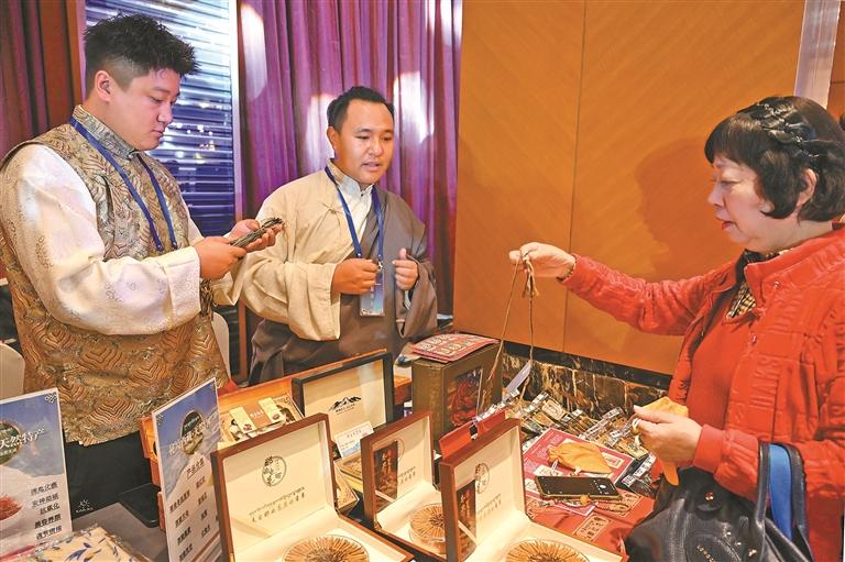 第八屆中國國際進口博覽會西藏自治區(qū)招商引資推介會上,顧客正在選購商品。記者 王敏 索朗瓊珠 嘎松卓瑪 攝
