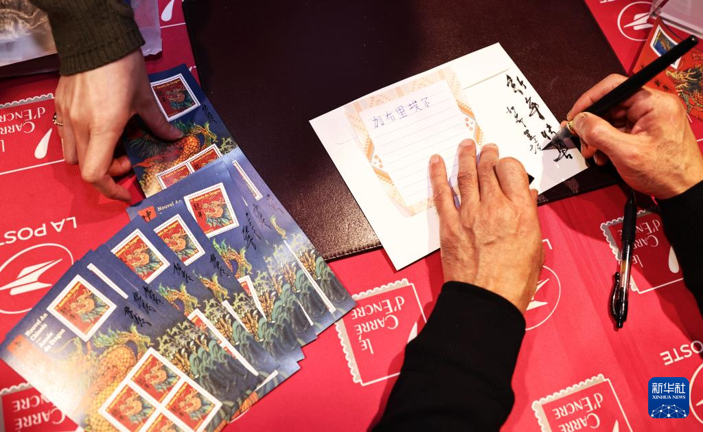 1月26日,在法國巴黎舉行的發(fā)行儀式上,郵票設(shè)計(jì)者陳江洪為當(dāng)?shù)丶]愛好者簽字留念。新華社記者 高靜 攝