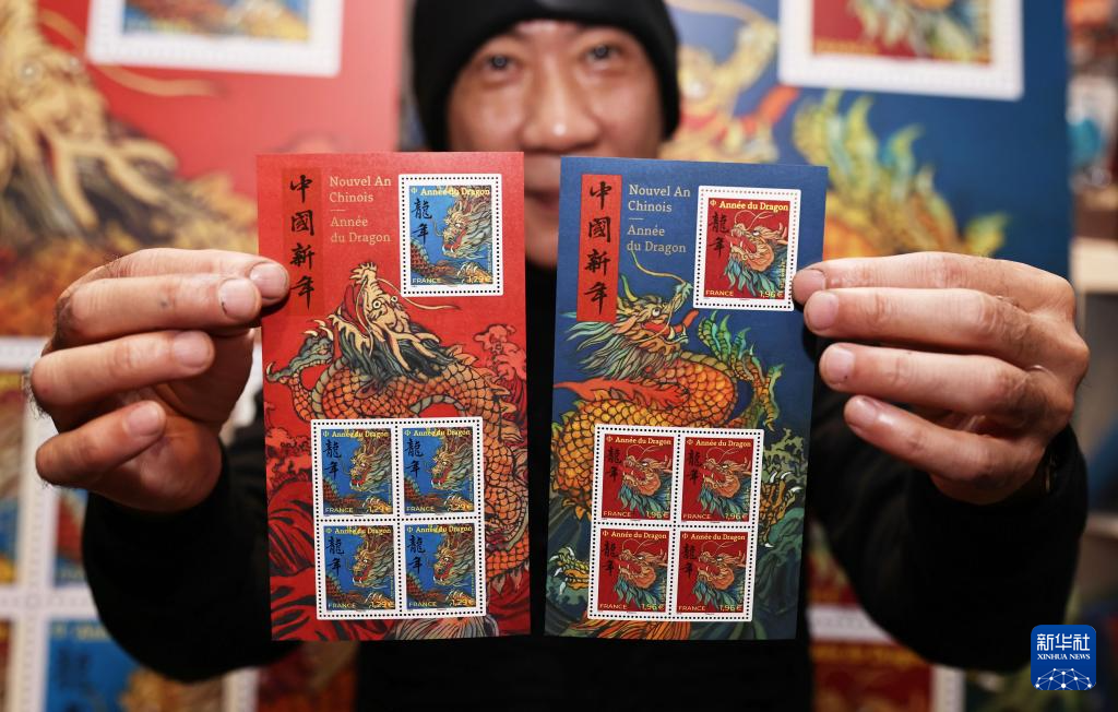 為迎接中國農(nóng)歷新年,法國郵政集團(tuán)26日在巴黎舉行中國龍年生肖紀(jì)念郵票發(fā)行儀式。中國龍年生肖紀(jì)念郵票共兩款,由法國華人藝術(shù)家陳江洪設(shè)計(jì)。其中,一款郵資1.29歐元,票面是藍(lán)色背景上繪制著一條翱翔的飛龍;另一款郵資1.96歐元,票面是紅色背景襯托著一顆昂首向上的龍頭。兩款郵票票面上均用中文和法語書寫著“龍年”字樣。