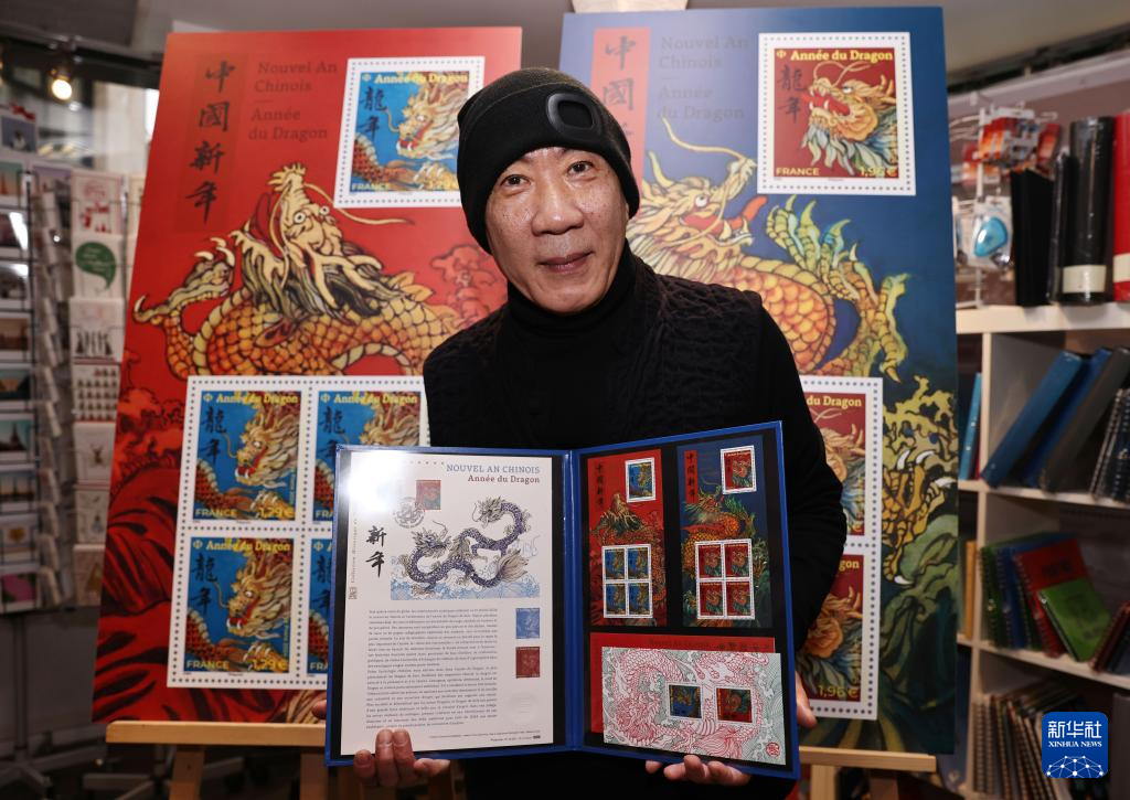 1月26日,在法國巴黎舉行的發(fā)行儀式上,郵票設(shè)計(jì)者陳江洪展示龍年生肖紀(jì)念郵票。新華社記者 高靜 攝
