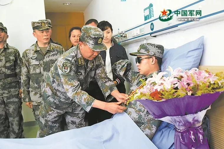 2018年11月24日,掃雷大隊(duì)為躺在病床上的杜富國頒授一等功獎(jiǎng)?wù)?,他?xí)慣性地舉起右臂,向頒獎(jiǎng)?wù)咧乱詿o手的軍禮。