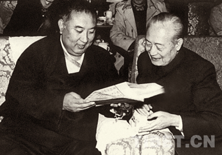 趙樸老與十世班禪大師關(guān)系十分親密。趙樸老曾說,他和十世班禪大師的關(guān)系是“平生風(fēng)義兼師友”。趙樸老初見十世班禪大師是在1951年。1951年4月27日,年僅16歲的十世班禪大師受邀抵京,協(xié)助中央人民政府與西藏地方政府的和談工作,他積極貢獻(xiàn)智慧和力量,在歷史性時刻展現(xiàn)出了一代宗師愛國愛教的風(fēng)采。協(xié)議簽訂不久,中央安排十世班禪到上海、杭州等地參訪。6月6日上午,十世班禪一行由天津乘坐的專車徐徐抵達(dá)上海,上海各界人士600余人在華東軍政委員會主席饒漱石、副主席曾山等帶領(lǐng)下到車站迎接,十世班禪首次上海之行停留了5天,上海安排趙樸老陪同接待,這是趙樸老與十世班禪大師首次交集。據(jù)趙樸老回憶說,我有幸負(fù)責(zé)接待大師,安排了一次盛大的集會,讓上海的佛教群眾有機(jī)會參見。1953年5月30日,中國佛教協(xié)會成立,十世班禪大師當(dāng)選為名譽(yù)會長,趙樸老當(dāng)選為副會長兼秘書長,由此兩人互為師友將近半個世紀(jì)。