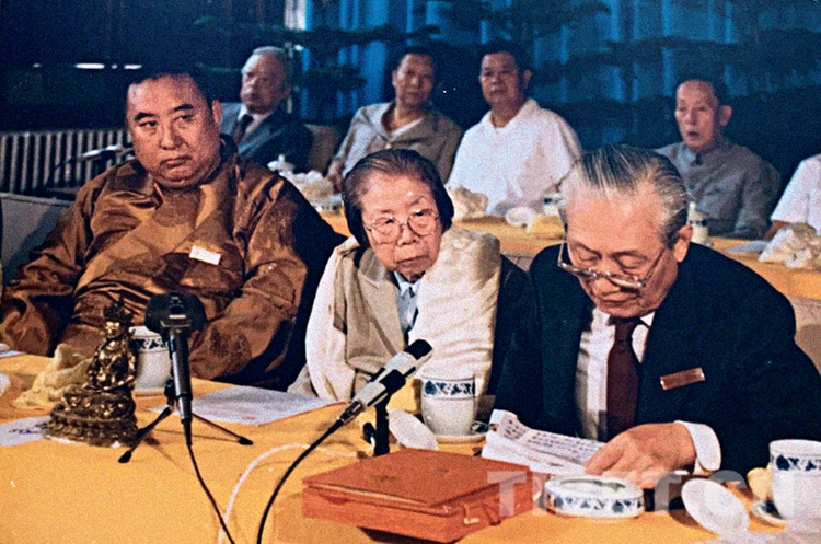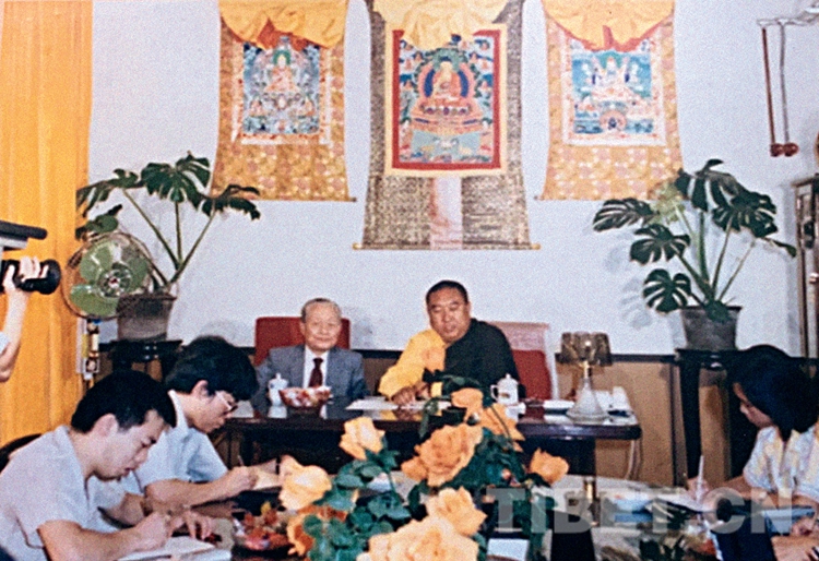 十世班禪和趙樸初顧問在中國藏語系高級佛學(xué)院成立儀式新聞發(fā)布會上接受媒體采訪。中國藏語系高級佛學(xué)院提供