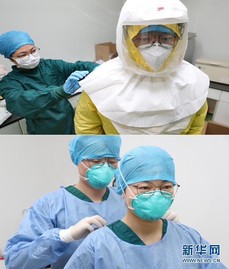 這張拼版照片顯示的是:2月25日,江蘇省南通市疾控中心病原微生物實(shí)驗(yàn)室的檢測(cè)人員郭陳(左)在清潔區(qū)幫助丈夫季霄雷穿防護(hù)服、戴正壓面罩(上);4月26日,季霄雷(左)幫助郭陳穿防護(hù)服(下)。“五一”前夕,江蘇省南通市疾控中心病原微生物實(shí)驗(yàn)室檢測(cè)組的90后黨員季霄雷和妻子郭陳以及其他同事依然堅(jiān)守在疫情防控第一線。 新華社發(fā)(許叢軍 攝)
