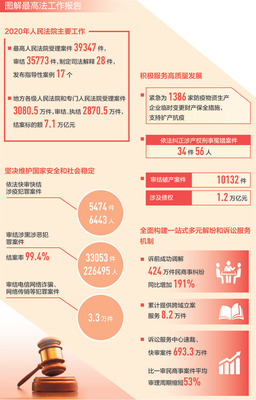 3月8日,十三屆全國(guó)人大四次會(huì)議聽取和審議了最高人民法院院長(zhǎng)周強(qiáng)所作的最高人民法院工作報(bào)告。代表委員表示,過(guò)去一年,人民法院緊緊圍繞“努力讓人民群眾在每一個(gè)司法案件中感受到公平正義”目標(biāo),堅(jiān)持服務(wù)大局、司法為民、公正司法,忠實(shí)履行憲法法律賦予的職責(zé),依法服務(wù)統(tǒng)籌推進(jìn)疫情防控和經(jīng)濟(jì)社會(huì)發(fā)展,各項(xiàng)工作取得新成效。