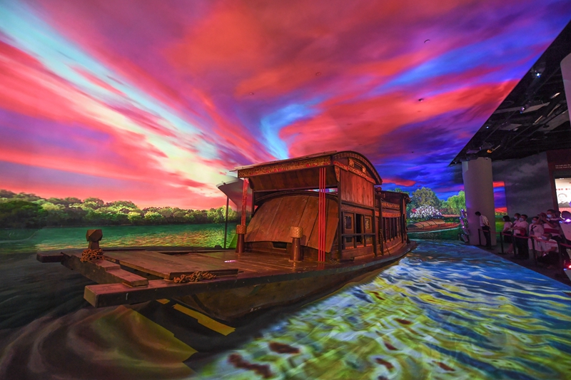 民族復(fù)興歷史任務(wù)是偉大建黨精神形成的時(shí)代背景。慶祝建黨百年之際,浙江嘉興的南湖革命紀(jì)念館迎來(lái)參觀熱潮,“紅船起航”主題展覽日均參觀人數(shù)超過(guò)10000人次。南湖革命紀(jì)念館基本陳列“紅船起航”主題展覽由“救亡圖存”、“開(kāi)天辟地”、“光輝歷程”、“走向復(fù)興”4個(gè)部分組成,全面展現(xiàn)100年來(lái),中國(guó)共產(chǎn)黨團(tuán)結(jié)帶領(lǐng)中國(guó)人民取得革命、建設(shè)和改革偉大勝利的光輝歷史。圖為參觀者在南湖革命紀(jì)念館內(nèi)參觀紅船模型及多媒體場(chǎng)景重現(xiàn)。新華社記者 徐昱/攝